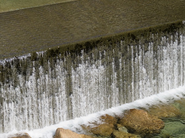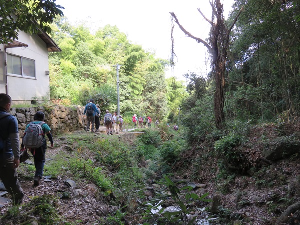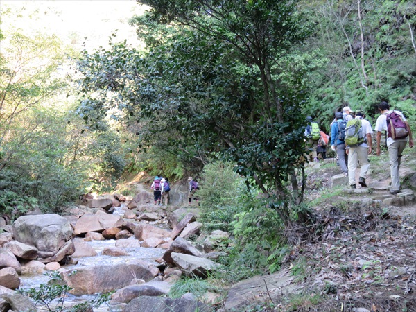 | 登山口でご挨拶 | 堰堤 | 絶壁の下を歩きます |