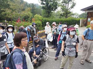車椅子は2台でした。1台に6~7人が介助につきました。途中あけびを見つけましたが大変甘く皆さん感動していました。わいわい言いながら登頂しました。