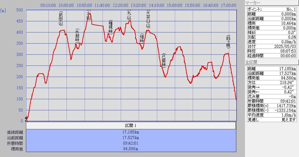 柚木城山15:10〜鈴が峰17:23〜井口中学校(解散)17:55〜JR井口駅18:11
