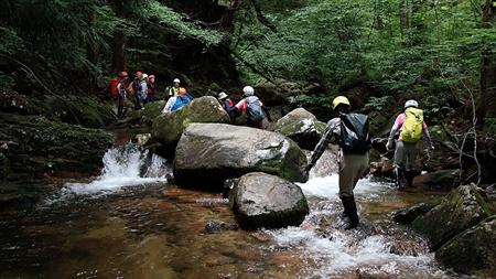 大滝ではロープで確保を行って参加者全員のシャワークライミングも実施しました。 2日前の雨でやや水量が多かったので、滝の本流を狙わずに、少し横の流れが弱いところをロープで安全確保して登って遊びました。 参加者全員無事に登れました。 3連滝の上部で渓流の涼感を楽しみながら昼食を摂った後、沢の終点目指してひたすら道なき道(というか川ですが)を各自の判断で深みに落ちないよう、滑ってコケないよう、 ベストなコースを慎重に選びながら歩きました。 3連滝から先の区間は水量がいい具合に増えていたので、深いところで腰くらいまで水に入りながら原生林探検のような不思議な景色の中を歩き、 全員ケガなく無事に沢の終点まで歩き通しました。