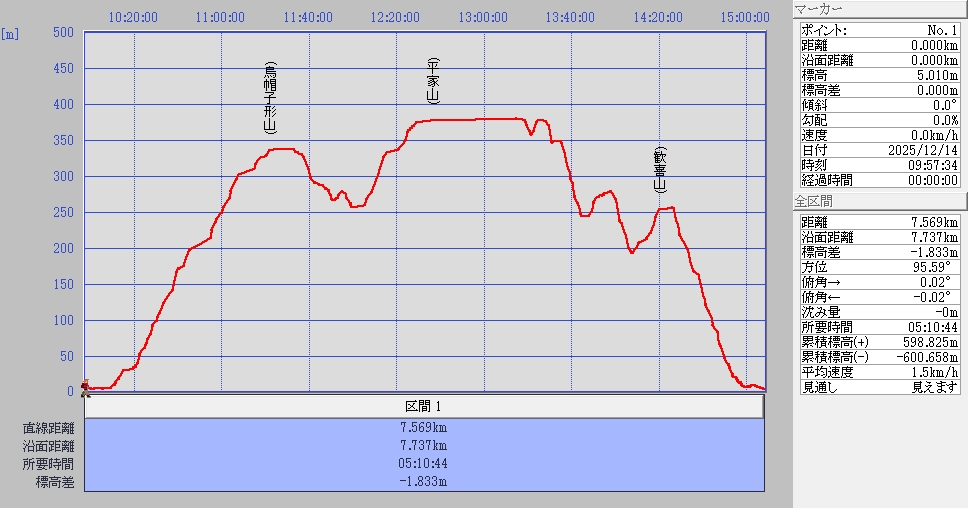 9:57 JR呉線 大乗駅出発 〜 10:15烏帽子形山登山口 〜 11:17烏帽子形山(おやつ休憩) 11:35出発 〜 12:27平家山(昼食) 13:20出発 〜 13:30東平家山 〜 14:12歓喜山 14:25出発 〜 14:50歓喜山登山口 〜 15:08 JR頭呉線 忠海駅