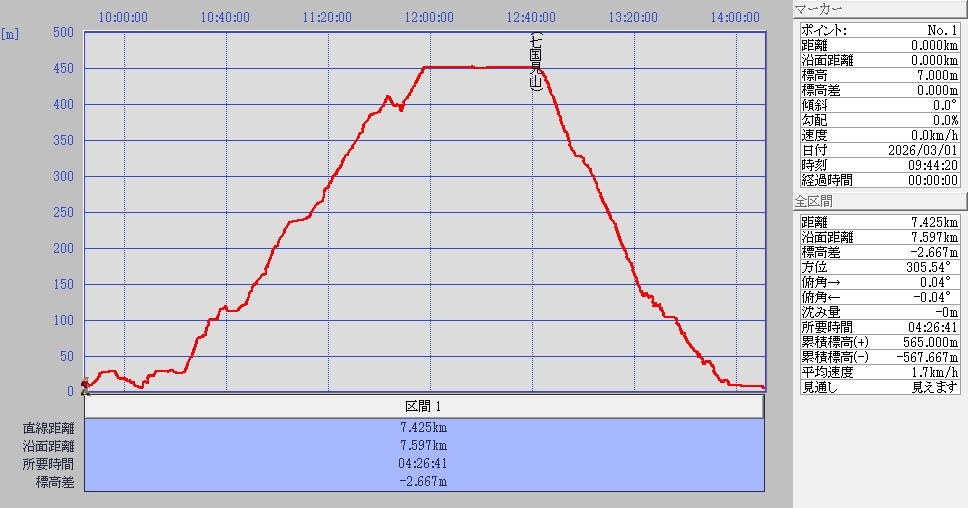 〜11:04観音堂11:15〜11:43ピーク(尾根)〜11:57七国見山山頂(昼食)12:40〜13:25林道出会い〜13:35十字路〜